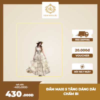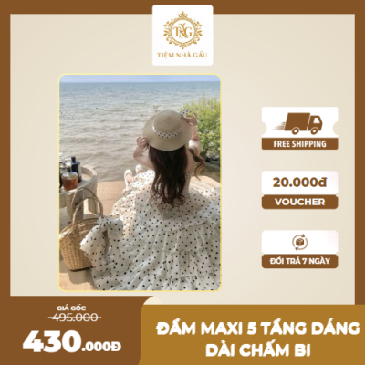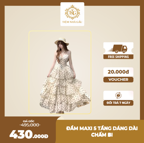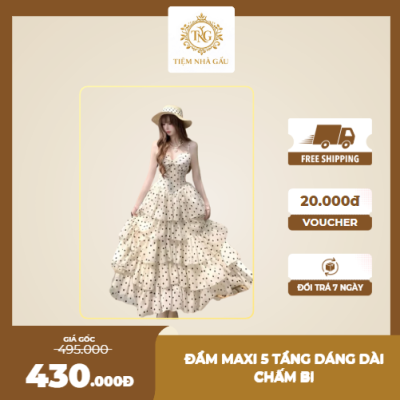 Mẫu đầm maxi chấm bi 5 tầng dáng dài mang đậm hơi thở cổ điển, nhẹ nhàng nhưng vô cùng cuốn hút. Thiết kế tầng tầng lớp lớp tạo độ bồng bềnh tự nhiên, giúp nàng trông thướt tha, nữ tính và “hack dáng” cực tốt.